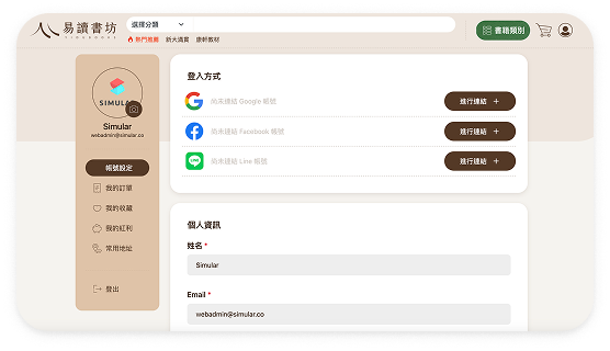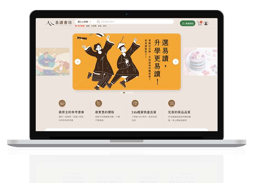 網站以易讀書坊Logo的米白色為主色調,日系非飽和色調設計,讓網站更有整體感,也減少用戶的視覺疲勞。