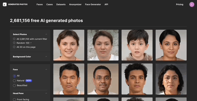 icons8的臉部圖書館中有將近270萬張AI生成人臉,比台北市的人口還多上一點點。篩選器中可以選擇性別、角度、髮色、眼色、背景顏色甚至表情,相信有大量人臉需求的設計例如聯絡人或留言頁面設計稿,一定可以在這裡找到適合的臉。