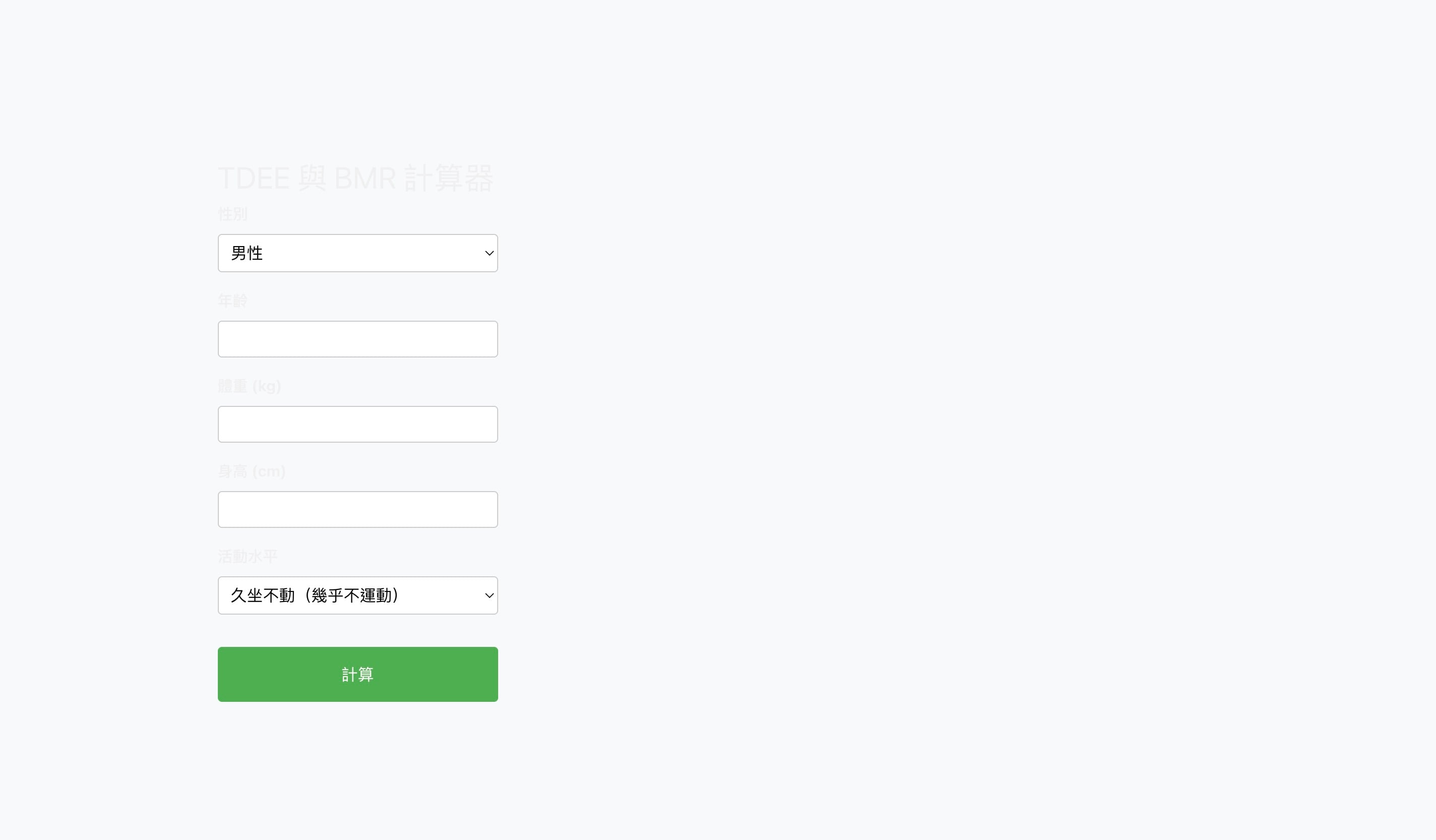 本文章夏格飛只用 Cursor + 口語化指令進行程式開發,不親手調整程式碼。預計製作一個簡單的卡路里計算器,可以藉由輸入身高、年齡與運動頻率等問題,計算出對應的基礎熱量消耗(BMR)與每日總熱量(TDEE)。下圖是最終成果。
