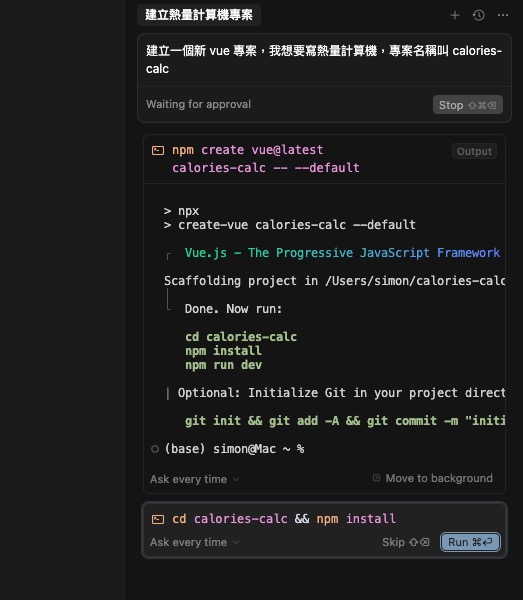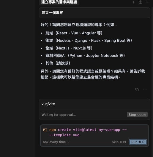 Cursor 會問你想要做什麼?用哪種程式語言?什麼工具之類的問題,一旦確定後,就會產生指令問你要不要執行,點擊 Run 就會開始。
