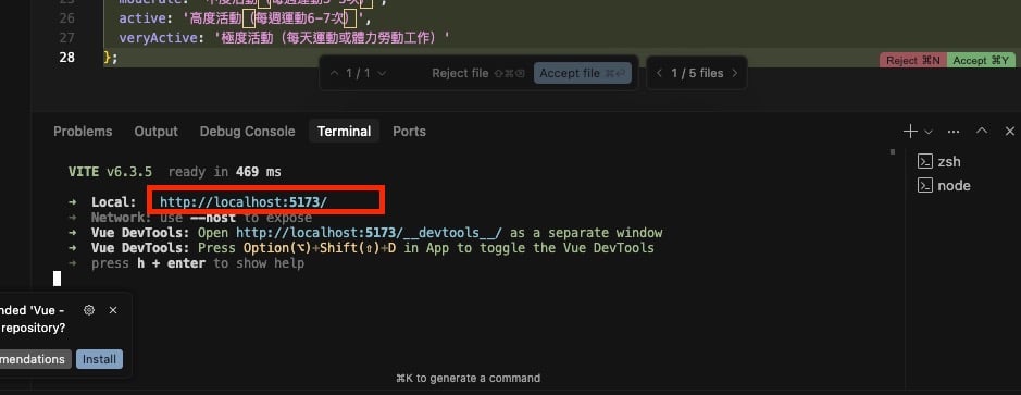 執行後,以 Vue/Vite 來說,會出現 localhost:5173 這樣的網址,把它輸入到瀏覽器打開就可以了,或是 Command or Ctrl + 點擊也可以打開:
