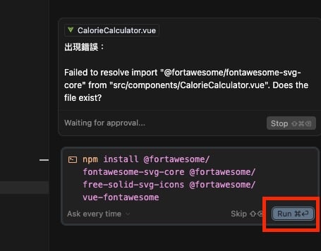 這樣 Cursor 可以精確的幫你產生要做的指令,按下 Run 給他跑就好。