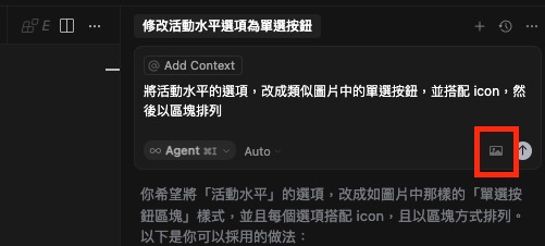 Cursor 的對話框,可以上傳圖片,讓他自動根據圖片調整版面,我把上面那張圖片上傳給 Cursor,接著下指令: