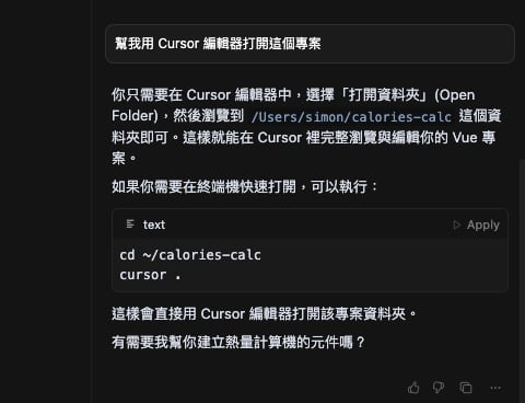 要注意的是,最後如果 Cursor 問你要不要執行,妳選擇了執行,是不會成功的。因為我們其實還沒有把那個專案打開。妳可以問 Cursor 如何打開專案,他會教你: