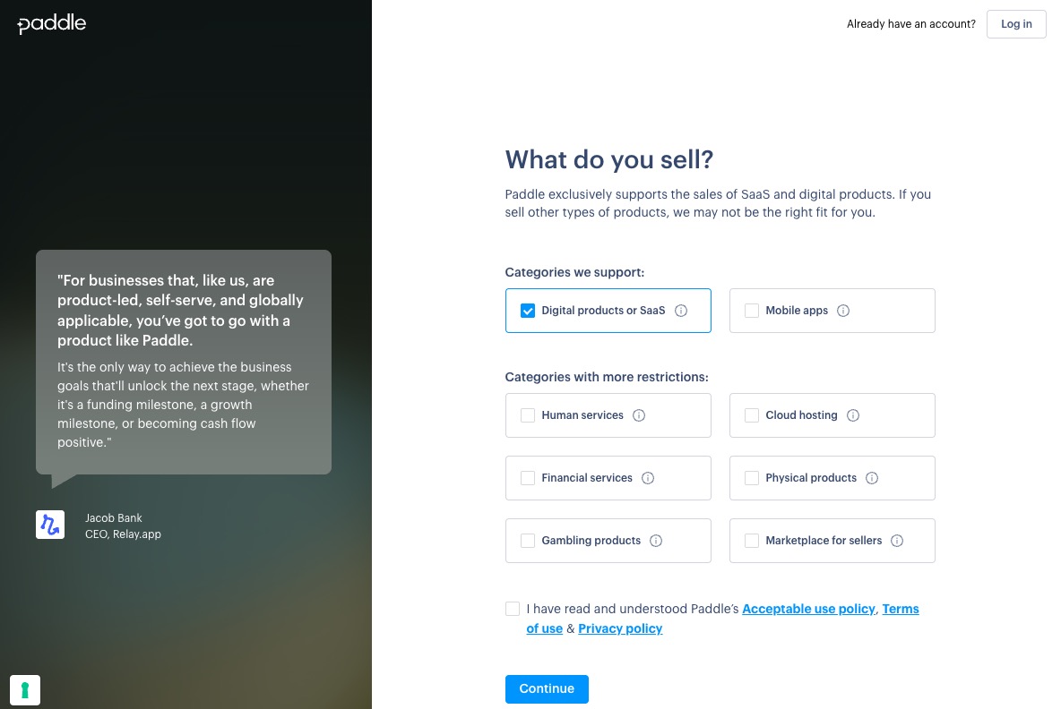 前往 Paddle 官網註冊頁面,一開始會問您的產業類別,如果是 SaaS 或數位商品就選擇第一個選項即可,此時也可以檢視您的產業是不是受限制的類別。