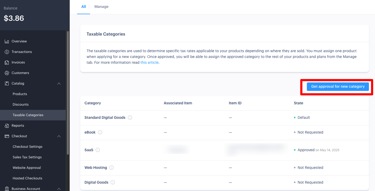 另外,在開始收款前,建議也將稅務分類申請好,假設您的服務是 SaaS 的話,SaaS 有專用的稅務分類,前往 Taxable Categories ,按下 Get approval for new category ,然後選擇 SaaS 與對應的產品即可(事先要建立一個產品),過幾天就會審核通過了。