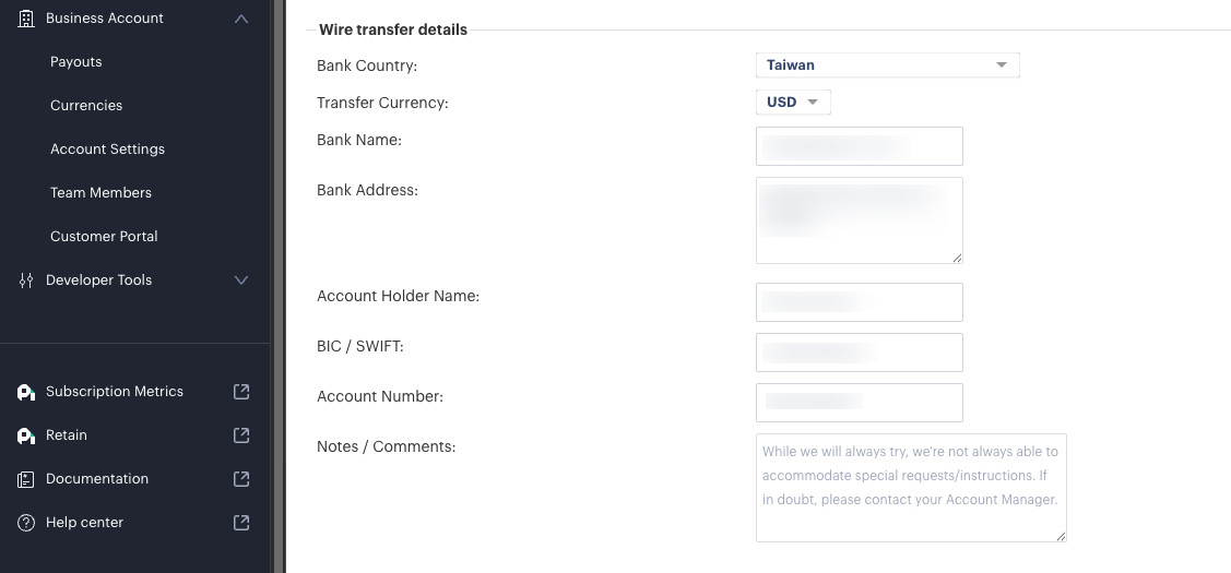 為了收取 Paddle 款項,您也需要填寫收款資料,可前往 Business Account > Payouts > Payout Settings 填寫。Paddle 支援 Paypal 付款與銀行電匯,每月超過 1000USD 的情況下,電匯會比較便宜,反之則可以選 Paypal。